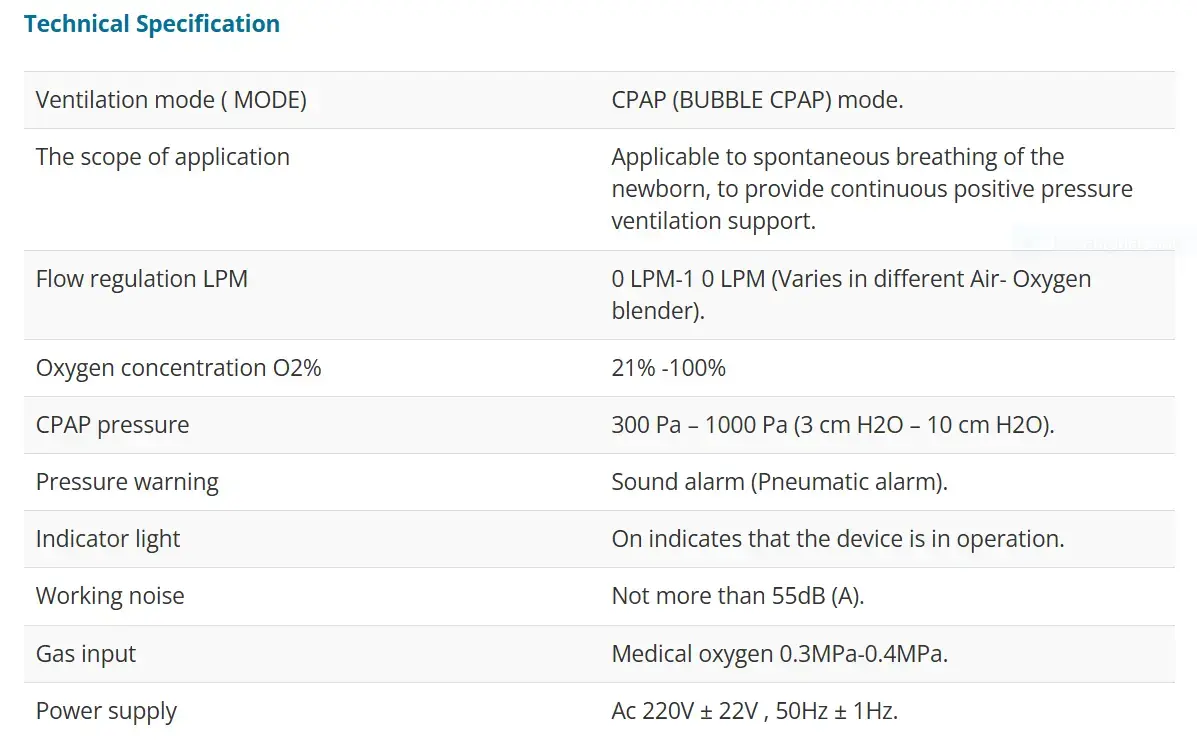 Neonatal continuous positive airway pressure support system with nasal or nasal congestion CPAP (Nasal-CPAP) will continue to positive air flow into the airway CPAP ventilator. Refers to the spontaneous breathing conditions, the patient should have a stable respiratory drive force and the appropriate tidal volume, in the entire breathing cycle of artificial imposition of a certain degree of positive airway pressure, which is conducive to prevent airway collapse, increase the functional residual capacity , Improve lung compliance, and improve oxygenation. In this mode, the ventilator only maintains a certain positive airway pressure, without mechanical ventilation. For spontaneous breathing of the newborn, to provide continuous positive pressure ventilation support.